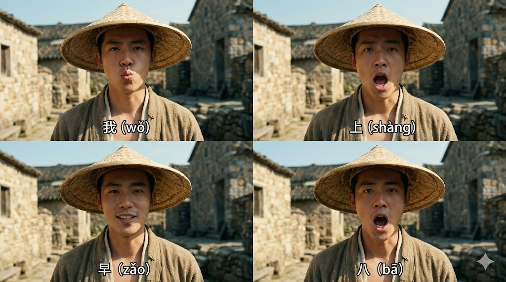 Prompt: Please draw a four-panel image showing the same young man wearing a bamboo hat pronouncing "wǒ" (我), "shàng" (上), "zǎo" (早), "bā" (八) respectively. The character's appearance should remain consistent, mouth shapes accurately correspond to each pronunciation, with unified overall style, 16:9, 4K