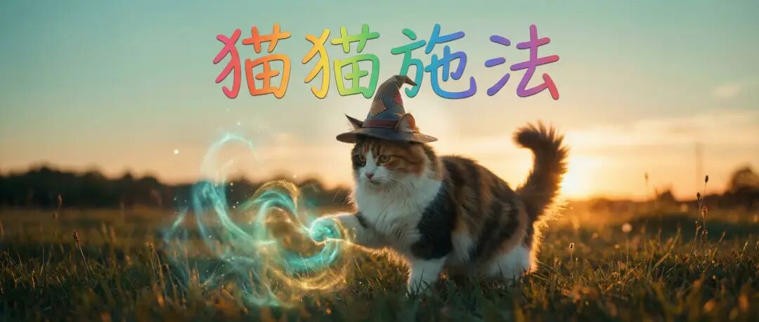 Example: A fluffy calico cat wearing a small wizard hat, casting magic on a sunlit grassland at sunset, low-angle shot, shallow depth of field (f/1.8), golden hour backlight creating long shadows, cinematic color grading with soft blue-green tones. Photorealism. 21:9 cinematic widescreen. Title "Cat Magic Casting" displayed at top in cute rainbow font.
