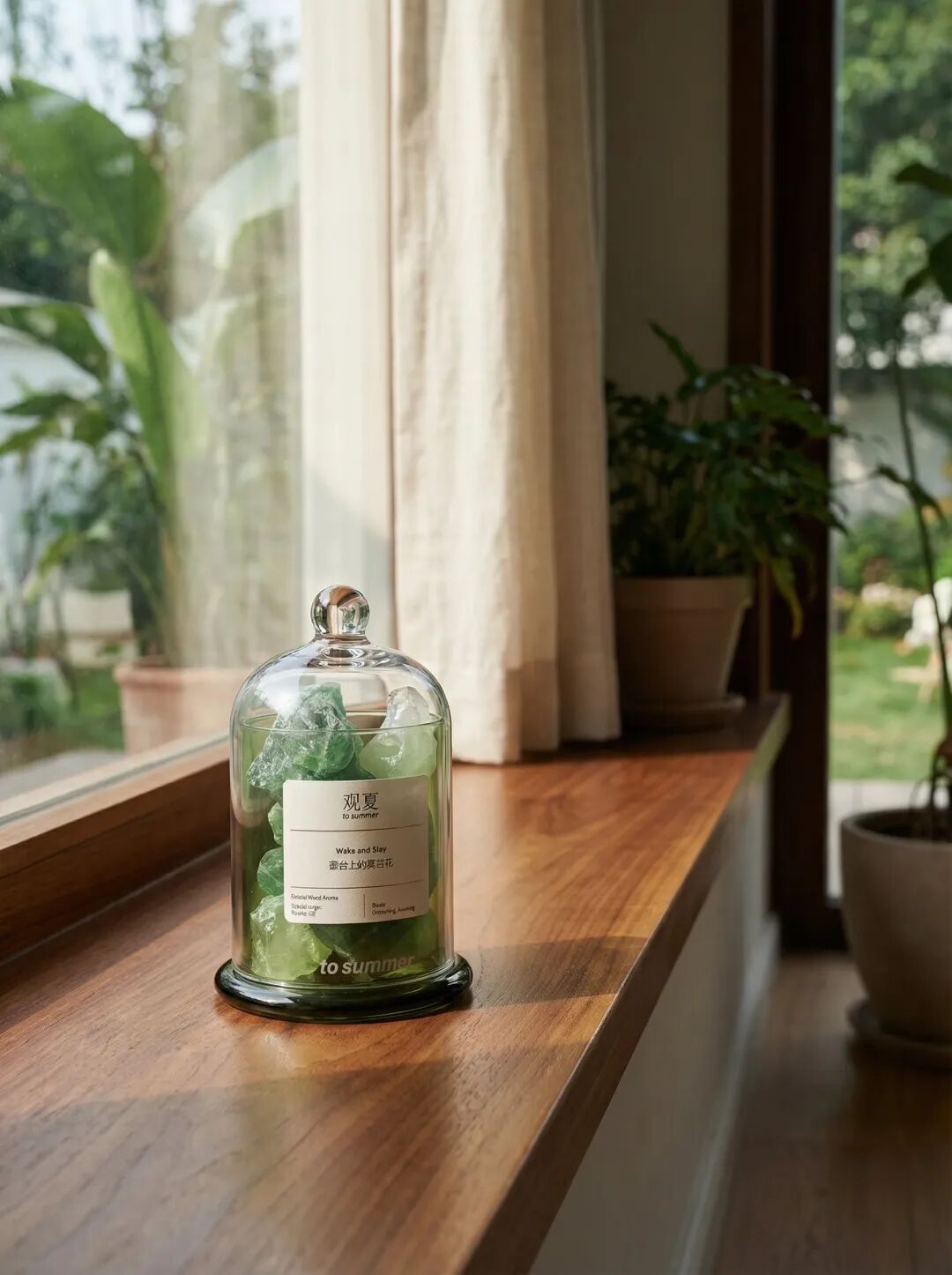 Prompt: Help me place this aromatherapy product in an interior space matching the design style, master photography, close-up shot