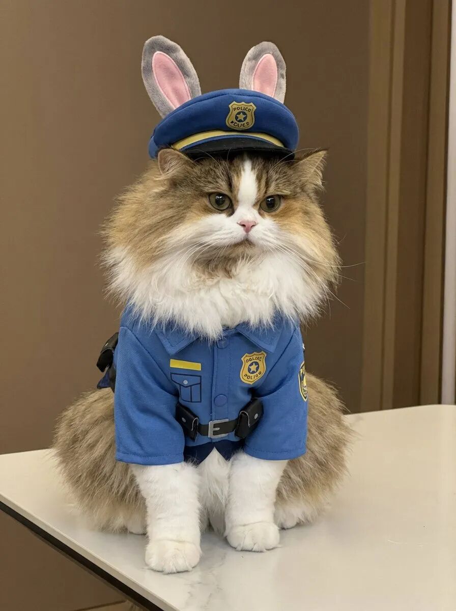 Prompt : Help my cat wear the Zootopia rabbit officer cosplay outfit, including head hat and clothes, reasonably fit the small cat, remove obstacles in front of the cat, maintain original composition and realistic style