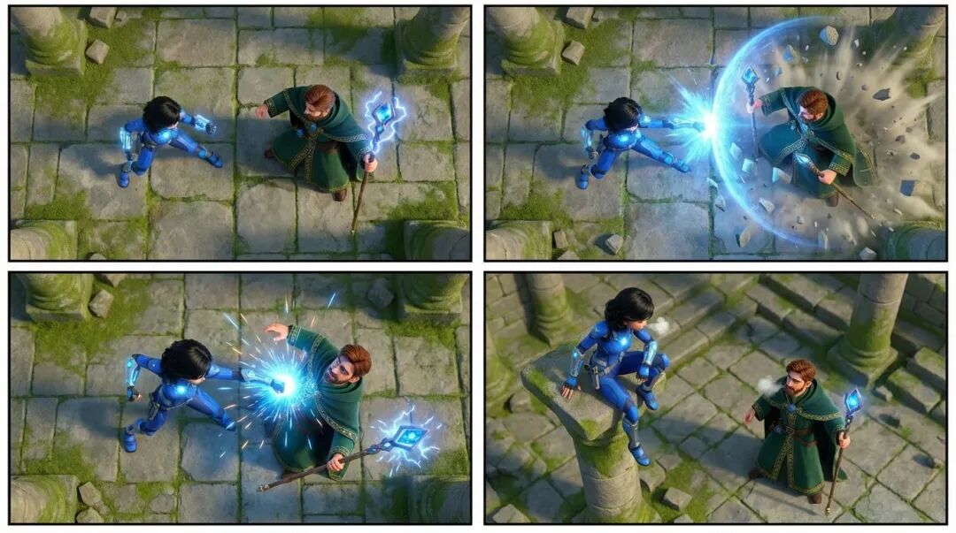 Prompt : Change the four-panel scenes to overhead top-down perspective