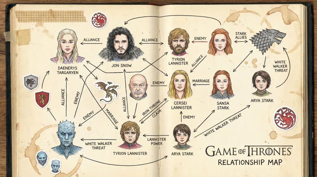 Prompt: A journal-style image showing character relationships and power dynamics from the TV series Game of Thrones, with character avatars