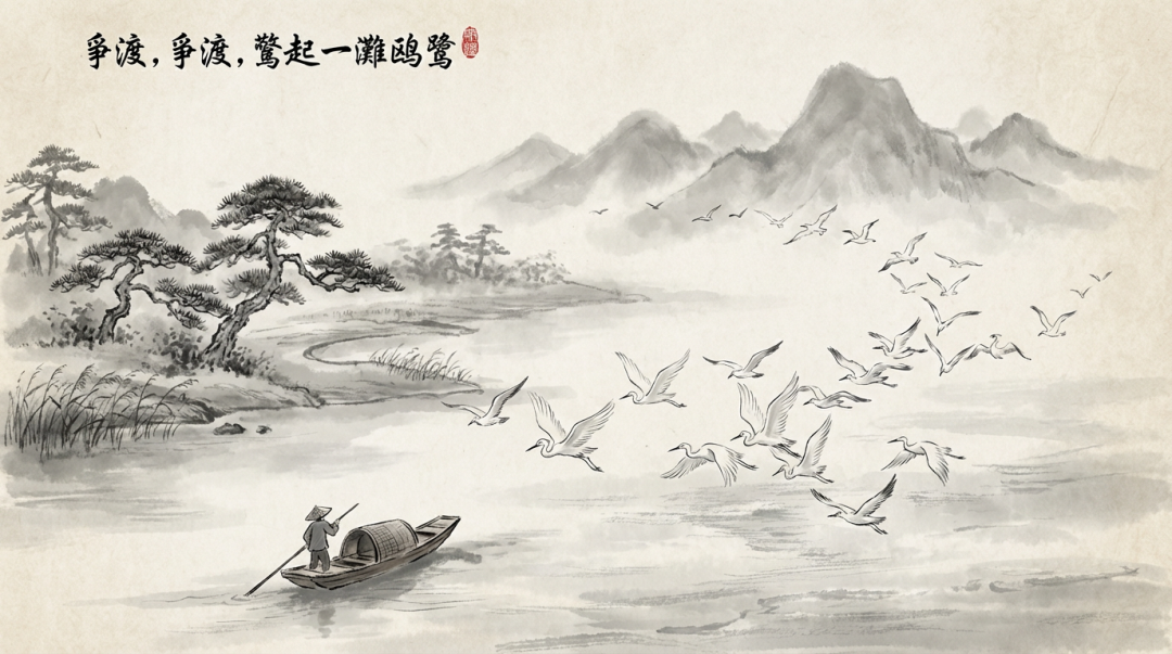 Prompt: At the top of the image, a long scroll with free calligraphy writing the complete poem "Song of the Pipa" by Bai Juyi, starting with "By the Xunyang River at night seeing off guests, maple leaves and reed flowers autumn rustling [full Pipa Song text] who cries most in the audience? Jiangzhou Prefect's green shirt is wet", while below using Chinese ink painting style to draw the corresponding scene for this poem