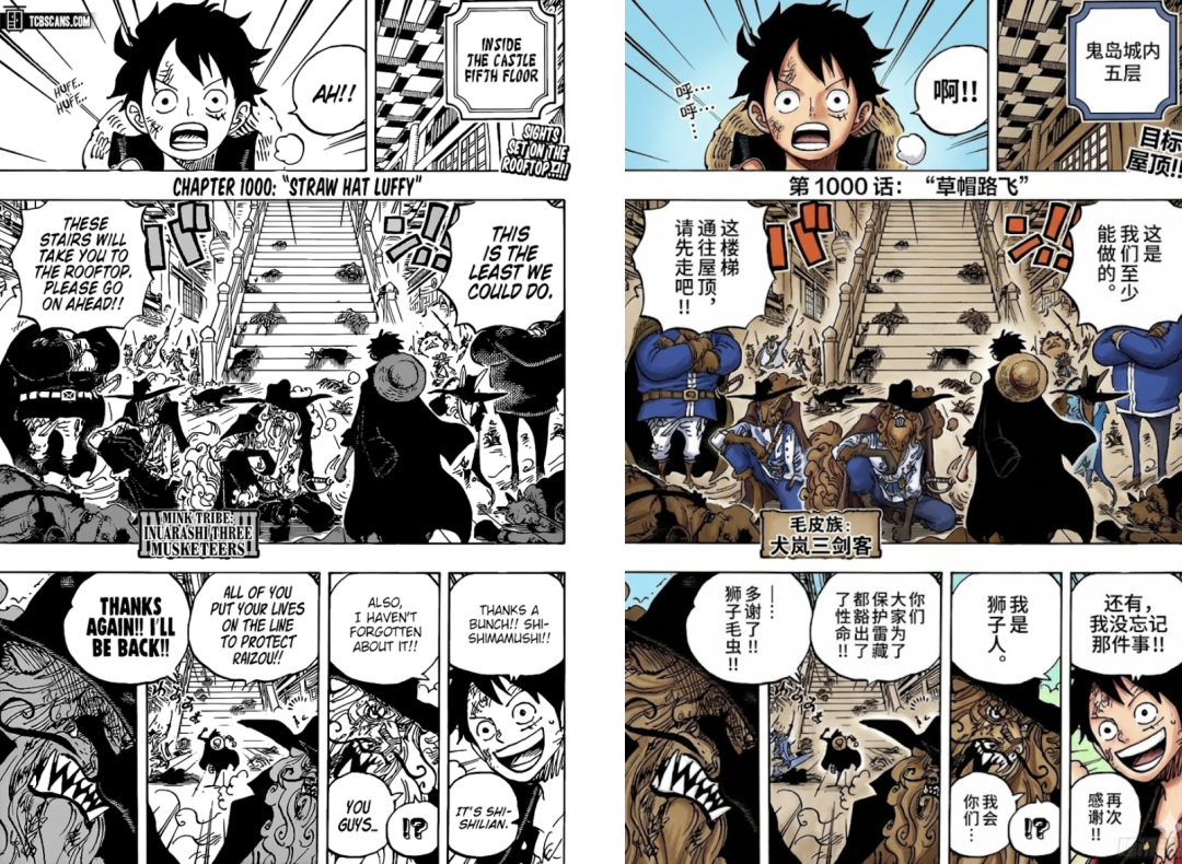 Prompt: (Example of translating and coloring complex One Piece manga pages)