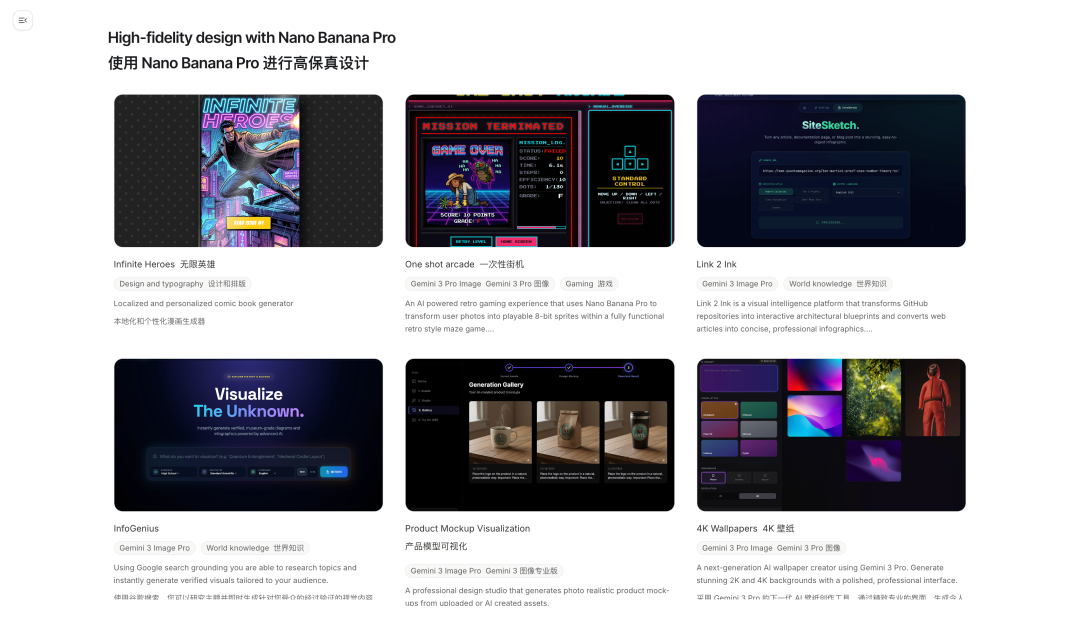 Google AI Studio provides multiple official projects showcasing Nano Banana Pro capabilities, including: