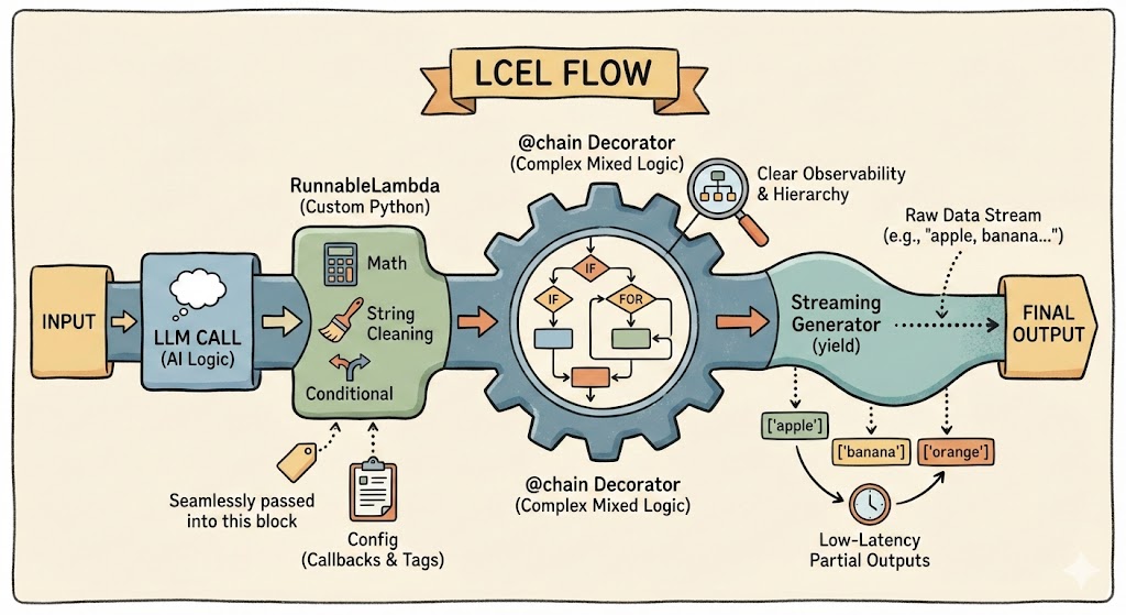 LCEL 不仅仅是调用 API,它允许你通过 Python 代码无缝嵌入复杂的业务逻辑。