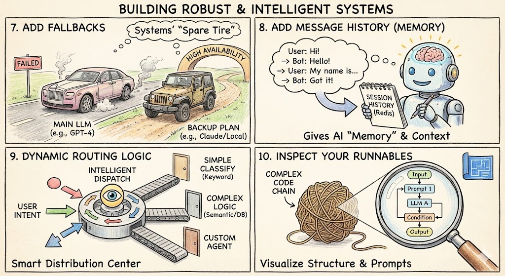 细节:不仅仅是模型,整个链条都可以回退。如果复杂的 RAG 链条失败,可以回退到一个简单的通用问答链条,确保用户永远不会看到"系统错误"。