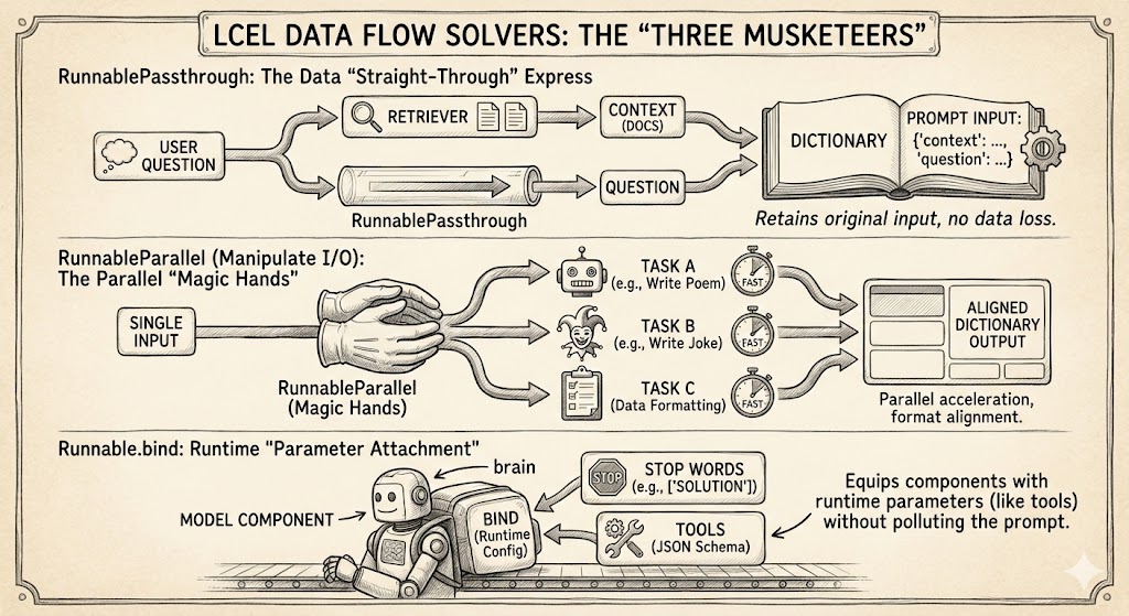 在构建 RAG(检索增强生成)或复杂链条时,数据如何在组件间传递是最大的痛点。以下三个特性是解决数据流问题的"三剑客"。