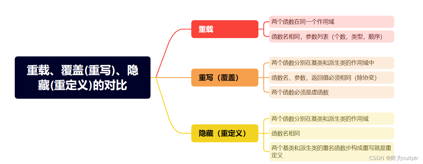 ④重载要求函数名相同、参数不同;重写要求原型相同(且基类函数是虚函数);重定义只需同名即可(参数可同可不同,会隐藏基类同名函数)