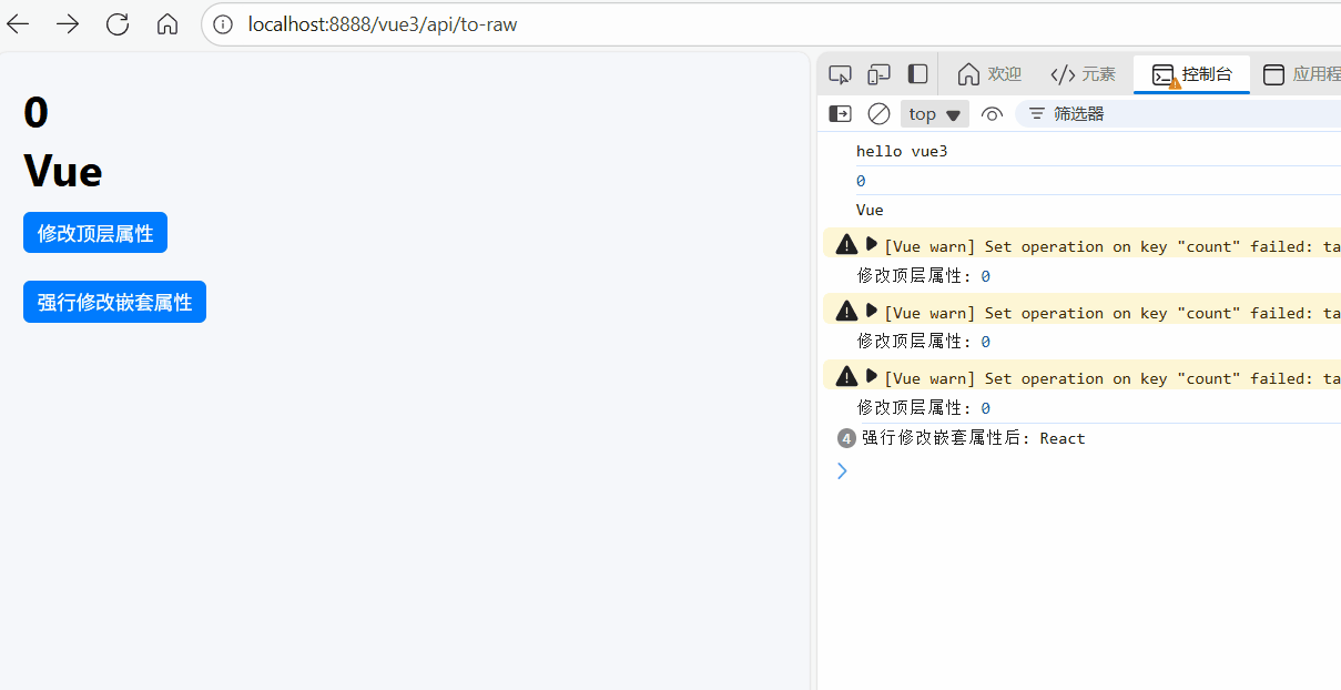 state.count是顶层属性,Vue 会阻止修改。state.nested.name是嵌套属性,Vue 不会阻止修改,也不会触发警告,但视图不会更新。