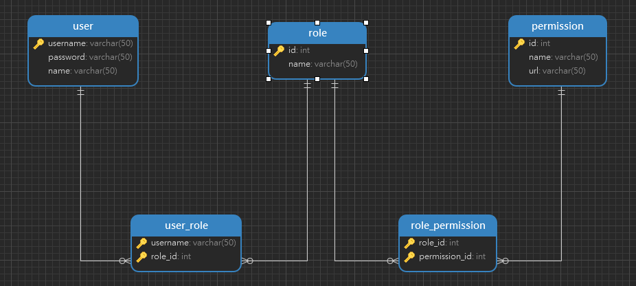 - 核心关联逻辑:用户 ↔ 角色(多对多)、角色 ↔ 权限(多对多);