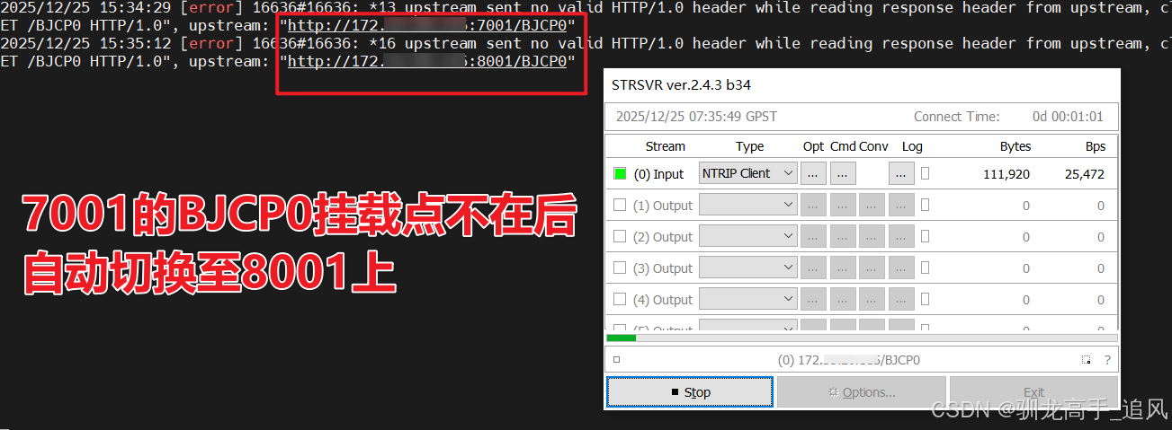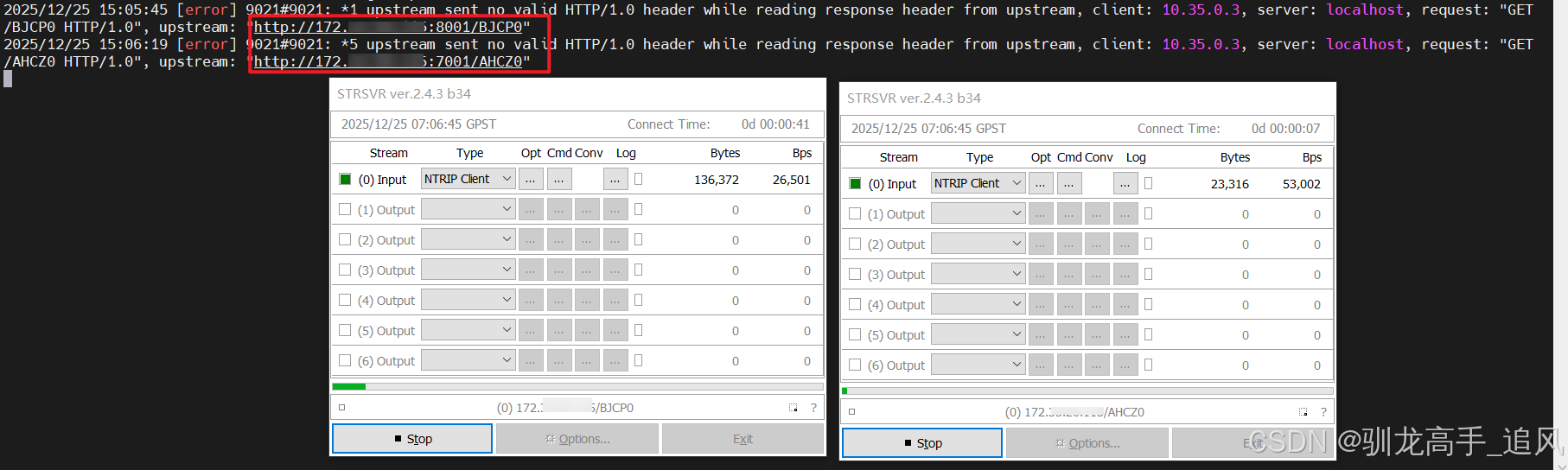 (1)目前后台连接数据流的时候会提示2025/12/25 15:57:26 [error] 16636#16636: *20 upstream sent no valid HTTP/1.0 header while reading response header from upstream, client: 10.35.0.3, server: localhost, request: "GET /BJCP0 HTTP/1.0", upstream: "http://172.XXX.XXX.XXX:8001/BJCP0",但不影响使用。