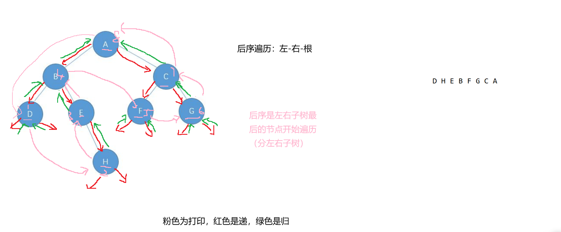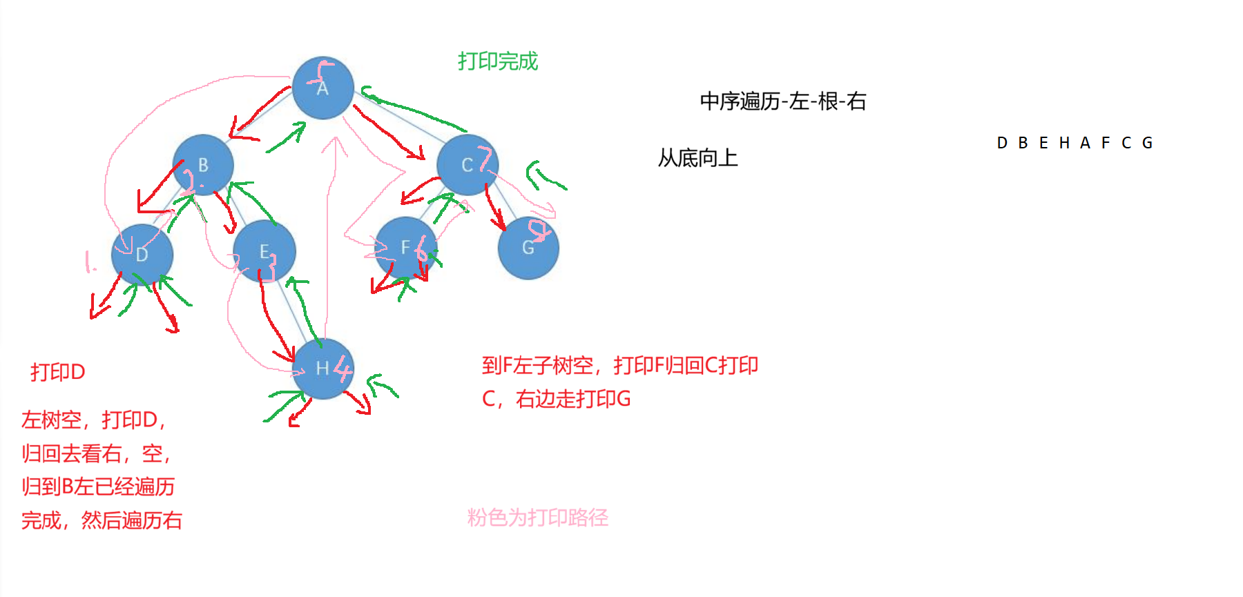 先从根出发,拿到A开始递左子树,然后递到B继续递左子树,拿到D继续递左子树,发现左子树为null,归一步回到D,然后递右子树发现为null,归到D,D的左右子树都遍历过,继续归到B,B的左子树D遍历完了直接遍历右子树拿到E再去右子树拿到H,然后H左右子树都是null继续归........后面就一直是这样子~最后拿到ABDEHCFG