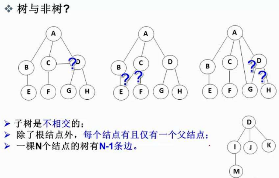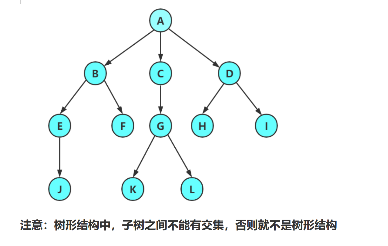 - 除根结点外,其余结点被分成M(M > 0)个互不相交的集合T1、T2、......、Tm,其中每一个集合Ti (1<= i<=m )又是一棵与树类似的子树。