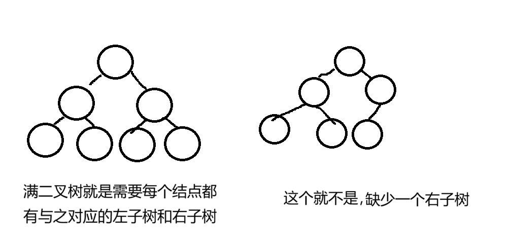 满二叉树还要求结点数为:2^k - 1(k为层数),我们可以看到画的第一个二叉树是有三层的也就是2^3-1 = 8-1=7,正好和节点数一样~所以我们可以认为只要每个结点都有与之对应的左子树和右子树就是一个满二叉树~~