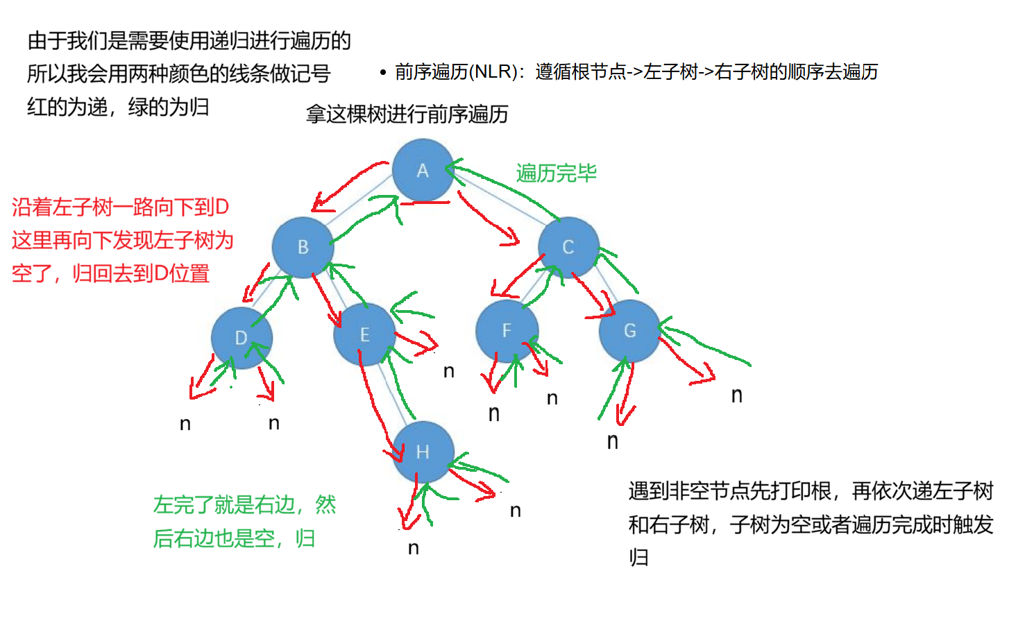 在上面已经知道前序遍历是根-左子树-右子树的顺序遍历的,这里我们来画图演示一下递归过程