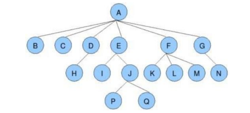 - 非终端结点或分支结点:度不为0的结点; 如上图:D、E、F、G...等节点为分支结点