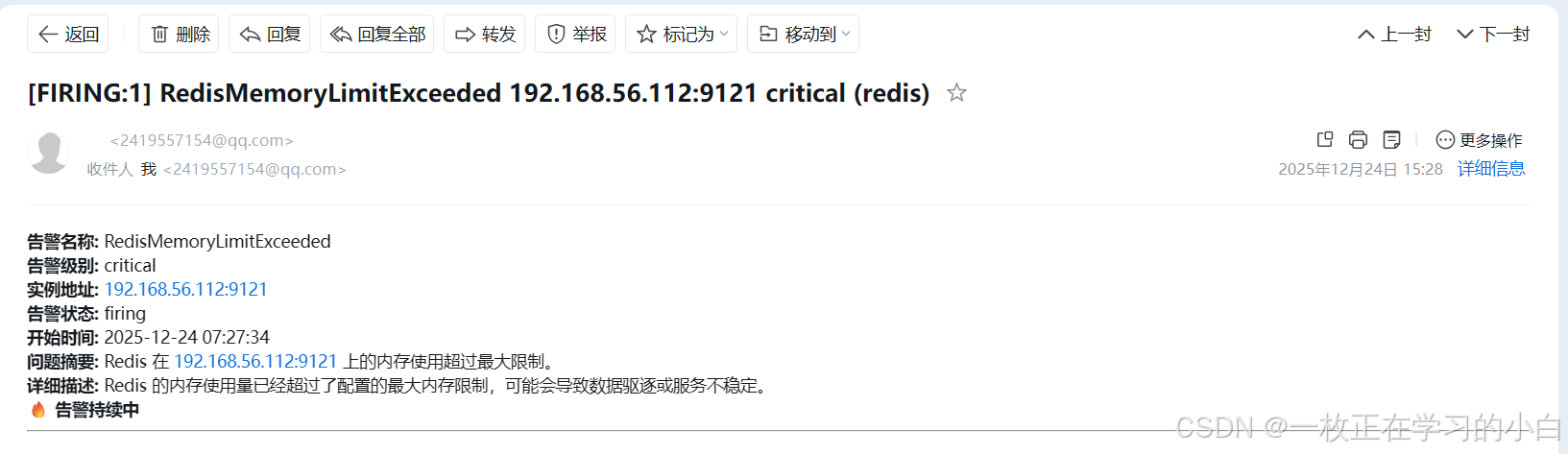 外发告警配置(邮件告警、企业微信告警)不在本文描述,可参考prometheus监控node_exporter中告警信息配置。