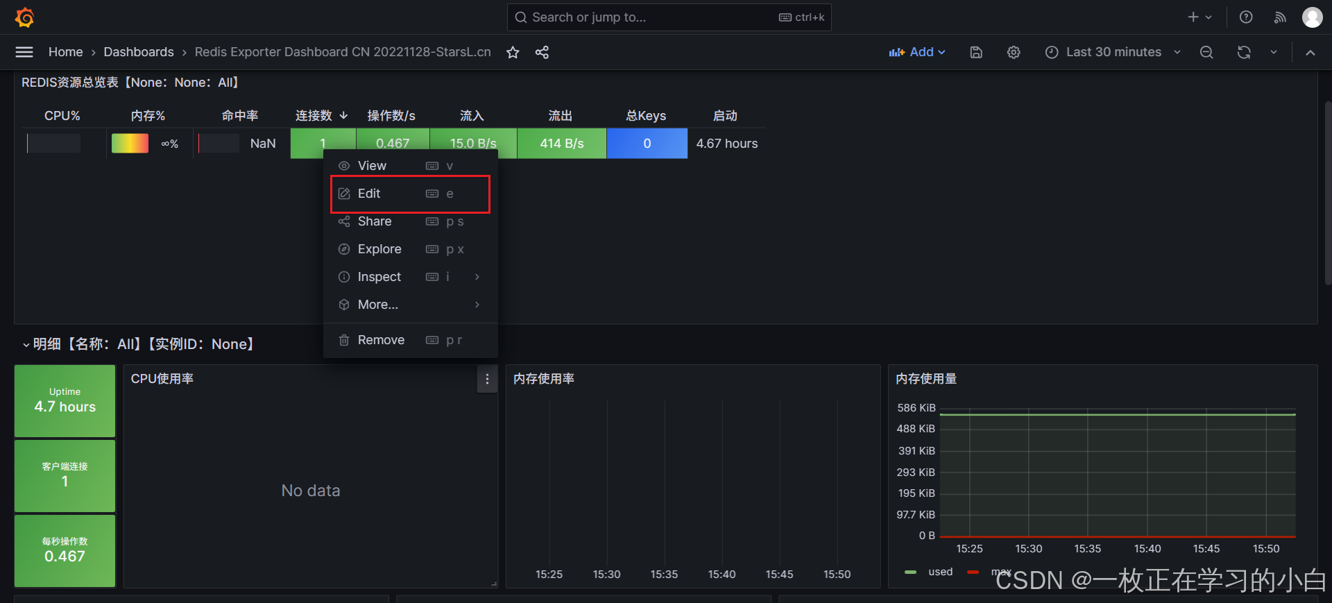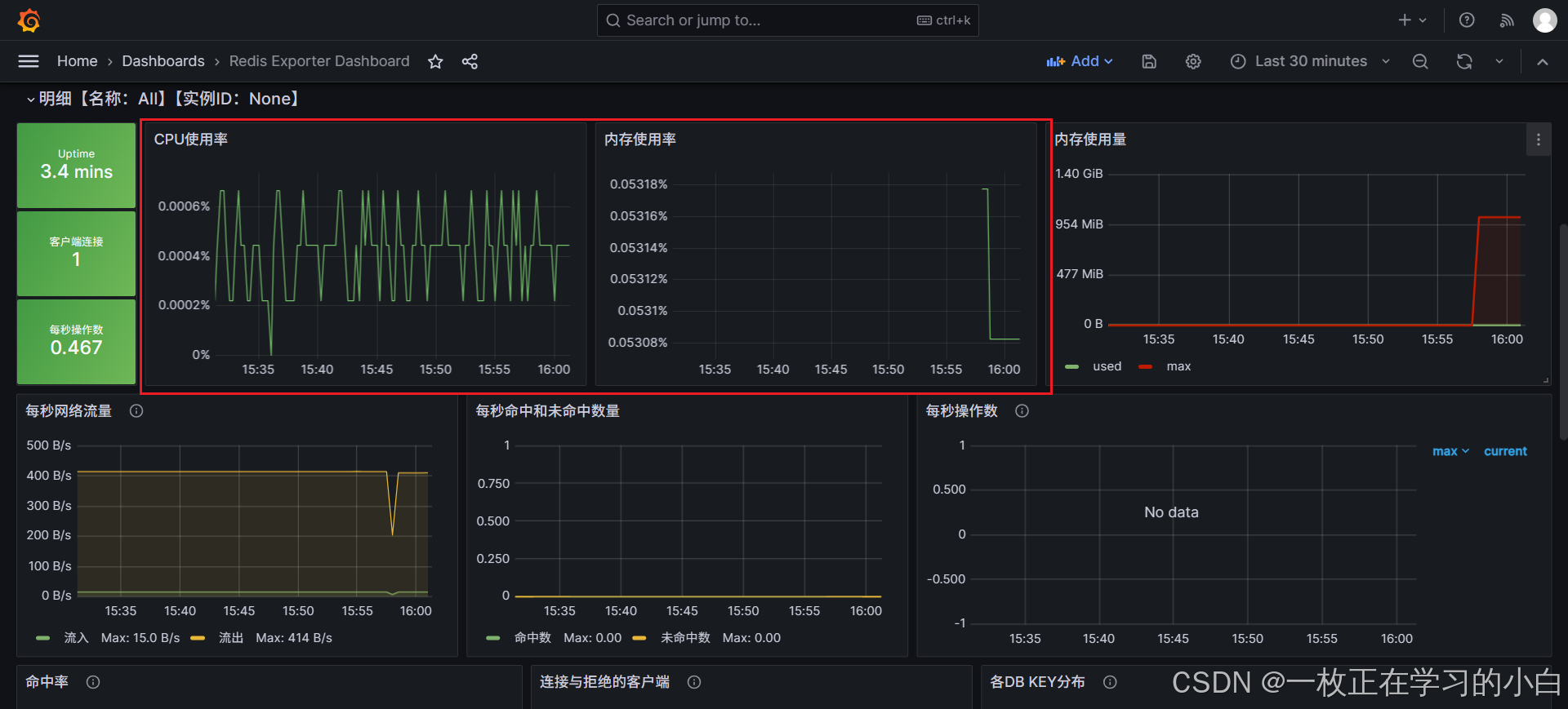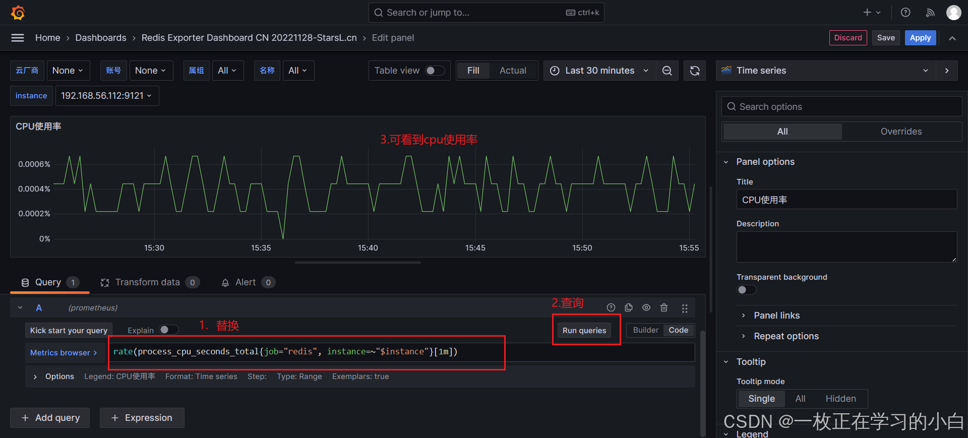 将原有的redis_cpu_util * on (iid) group_right redis_up{instance=~"$instance"}替换为rate(process_cpu_seconds_total{job="redis", instance=~"$instance"}[1m])