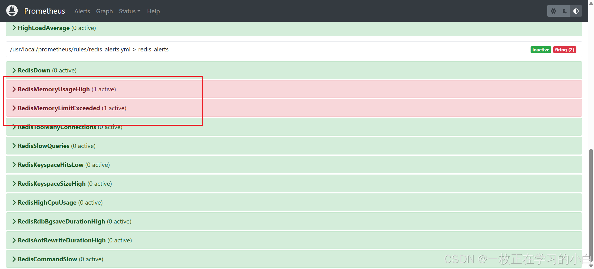 配置完成重启prometheus,由于redis没有配置最大内存,默认为0,会触发相关报警。