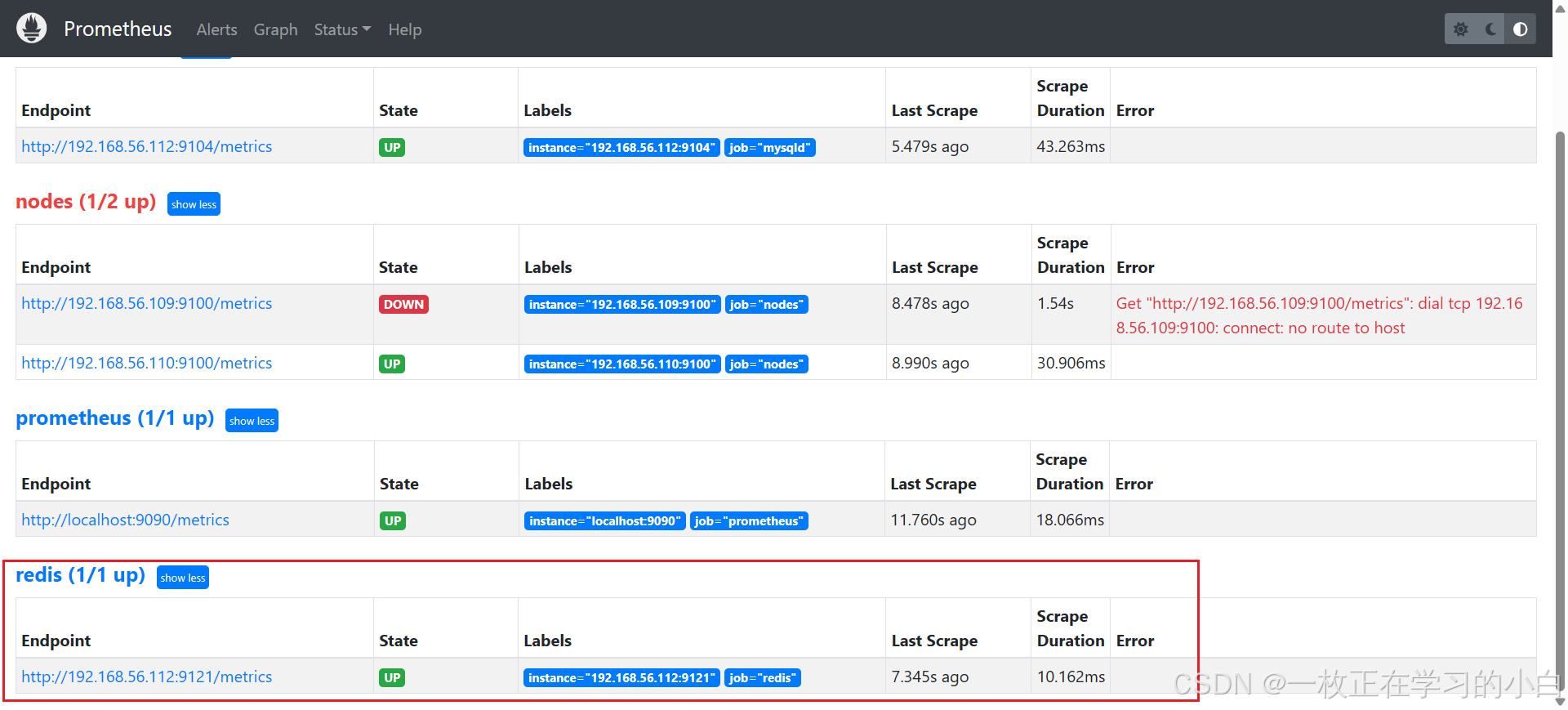 重启prometheus,可以看到prometheus连接redis_exporter成功