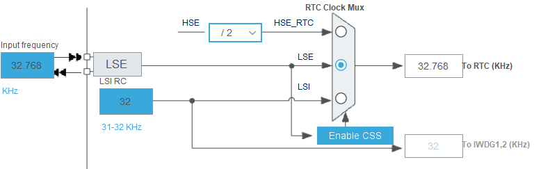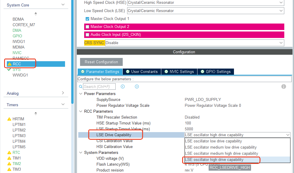 在STM32CubeMX的System Core -> RCC -> LSE Drive Capability中选择