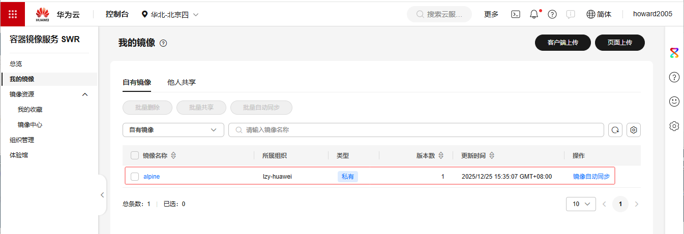 - 单击左边栏里的【我的镜像】,可以看到刚推送的