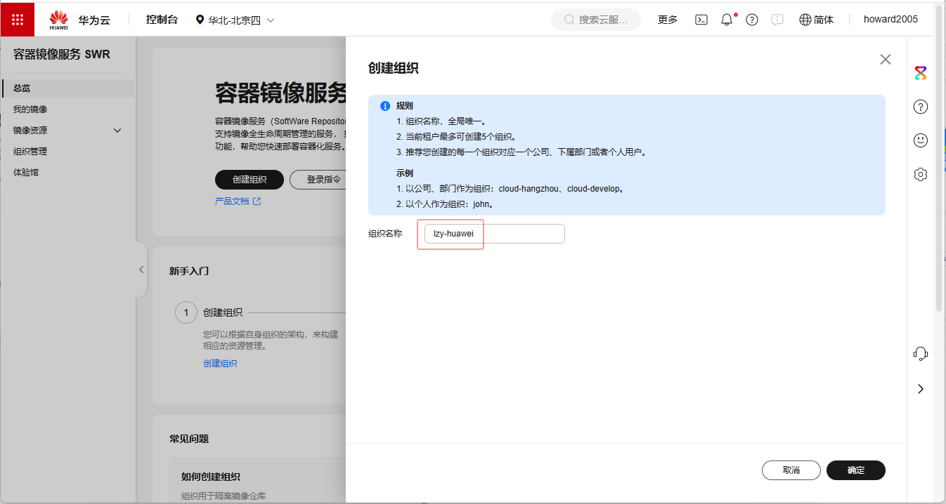 - 单击【创建组织】按钮,输入组织名