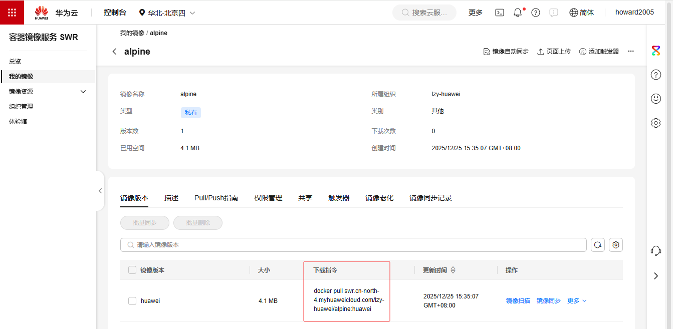 docker push swr.cn-north-4.myhuaweicloud.com/lzy-huawei/alpine:huawei
