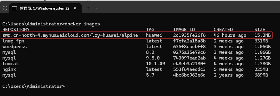 docker images,可以看到swr.cn-north-4.myhuaweicloud.com/lzy-huawei/alpine:huawei镜像