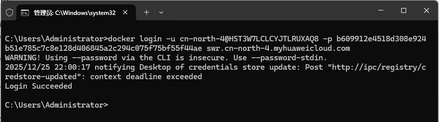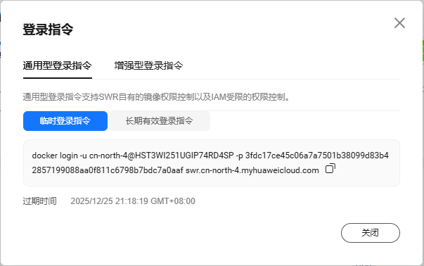 docker login -u cn-north-4@HST3WI251UGIP74RD4SP -p 3fdc17ce45c06a7a7501b38099d83b42857199088aa0f811c6798b7bdc7a0aaf swr.cn-north-4.myhuaweicloud.com