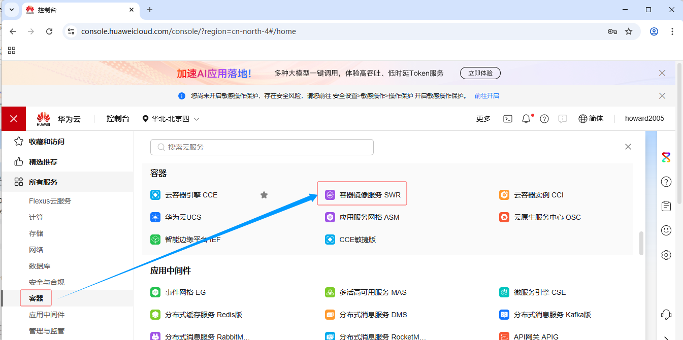 - 点开服务列表,选择【容器】里的【容器镜像服务 SWR】