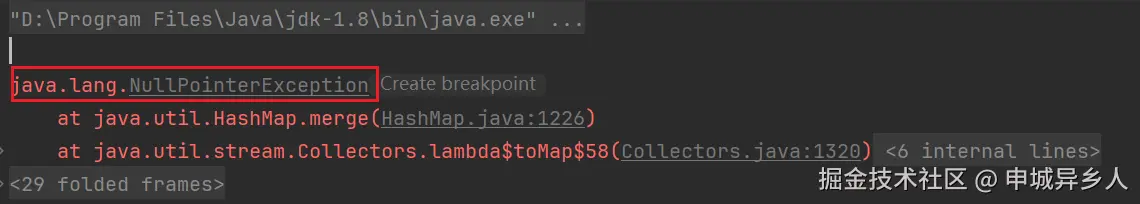 如果出现重复键,且没有提供mergeFunction参数,会抛出java.lang.IllegalStateException异常,如下示例: