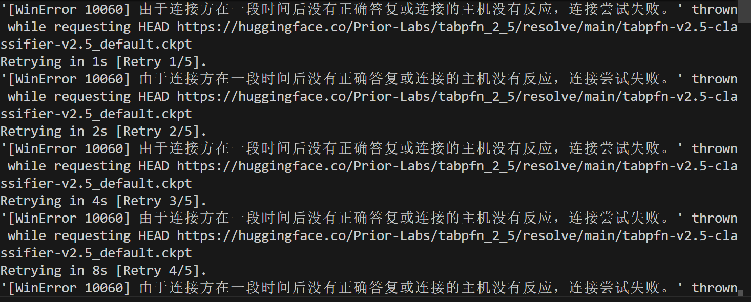 由于连接方在一段时间后没有正确答复或连接的主机没有反应,连接尝试失败。' thrown while requesting HEAD https://huggingface.co/Prior-Labs/tabpfn_2_5/resolve/main/tabpfn-v2.5-classifier-v2.5_default.ckpt