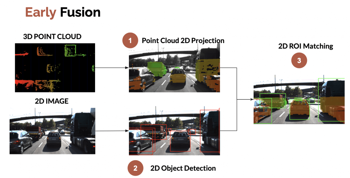 它的核心思想是:与其让摄像头和激光雷达各自"猜"一遍再对答案,不如先把激光雷达的 3D 点云和摄像头的 2D 像素在原始数据层面结合起来,生成**"彩色点云"或"深度图像"**,然后再送入神经网络进行检测。