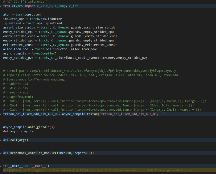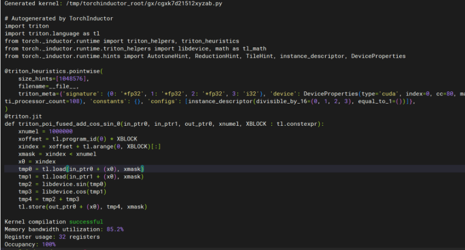 从代码可以看到,TorchInductor 生成了高度优化的 Triton kernel,包括: