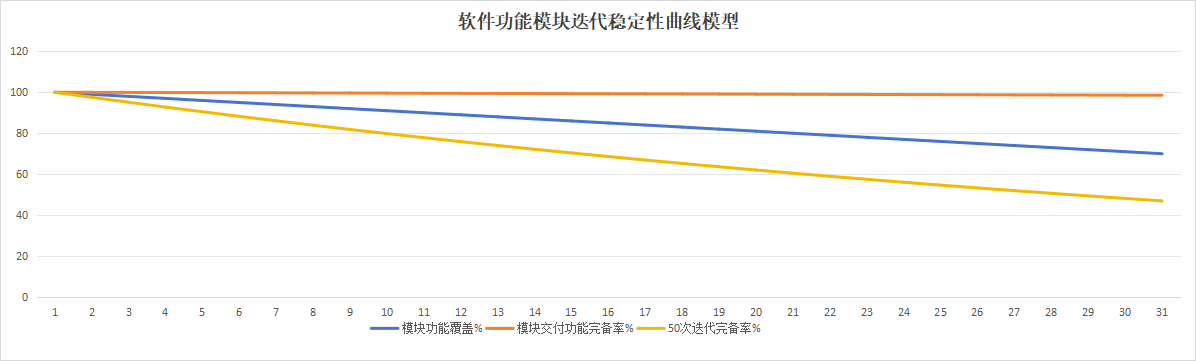 | 单模块开发功能覆盖率、单模块交付时的功能覆盖率、50次迭代后的功能覆盖率变化 单模块开发功能覆盖率覆盖99%,另外01%为当前场景不易触发问题,假设仅有5%概率出现,则首次交付功能覆盖率可达99.95% 单模块开发功能覆盖率覆盖70%,另外30%为当前场景不易触发问题,假设仅有5%概率出现,则首次交付功能覆盖率可达98.50% 从单个模块开发来看,影响很小,可以节省很多开发时间,从投入产出比来说第一种情况产出率底,无优势;第二种方式虽有小差异,但影响可控; 系统50次迭代后,第一种情况叠加后功能稳定性可以达到97.5%;第二种情况为46.96%; 功能稳定的系统,每个迭代都需要把工作做扎实,迭代层次多,还需要查缺补漏,才可以保持系统健壮性。道理大家都懂,实际操作过程中,只能感叹,人在江湖,身不由己! ||||||||||