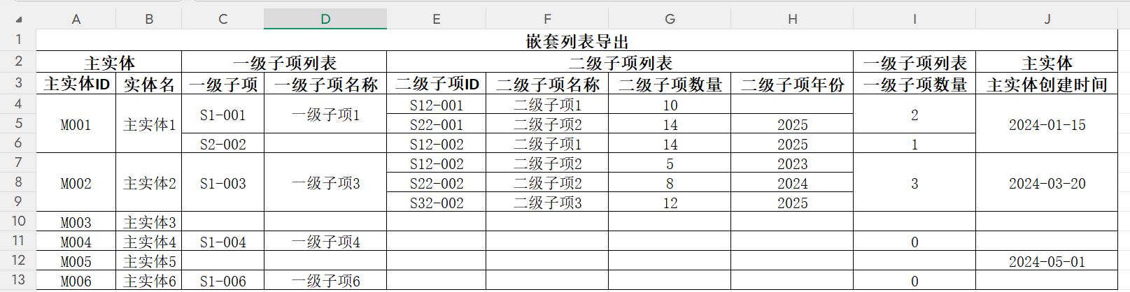 实际业务中,我们常遇到一对多甚至多对多 的数据关系。例如,一个主实体包含多个一级子项,每个一级子项又包含多个二级子项。传统平面表格难以直观展示这种层次关系,需要合并单元格 和多级表头来优化可读性。