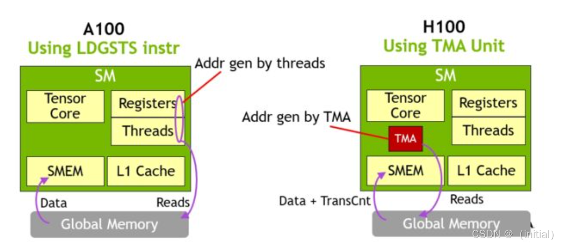 - 变革三:Asynchronous。指令发射后,Warp 不会阻塞,可以立即去处理下一块数据的加载(TMA)。