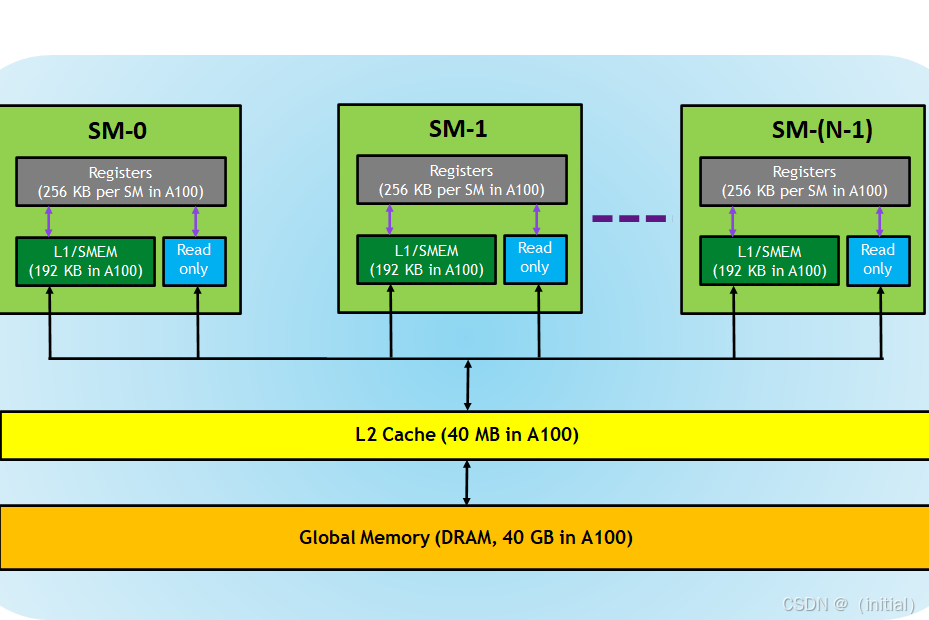 - L1 缓存:一种小型、快速的内存缓存,用于存储靠近 SM 内核的频繁访问的数据和指令,以减少访问时间。
