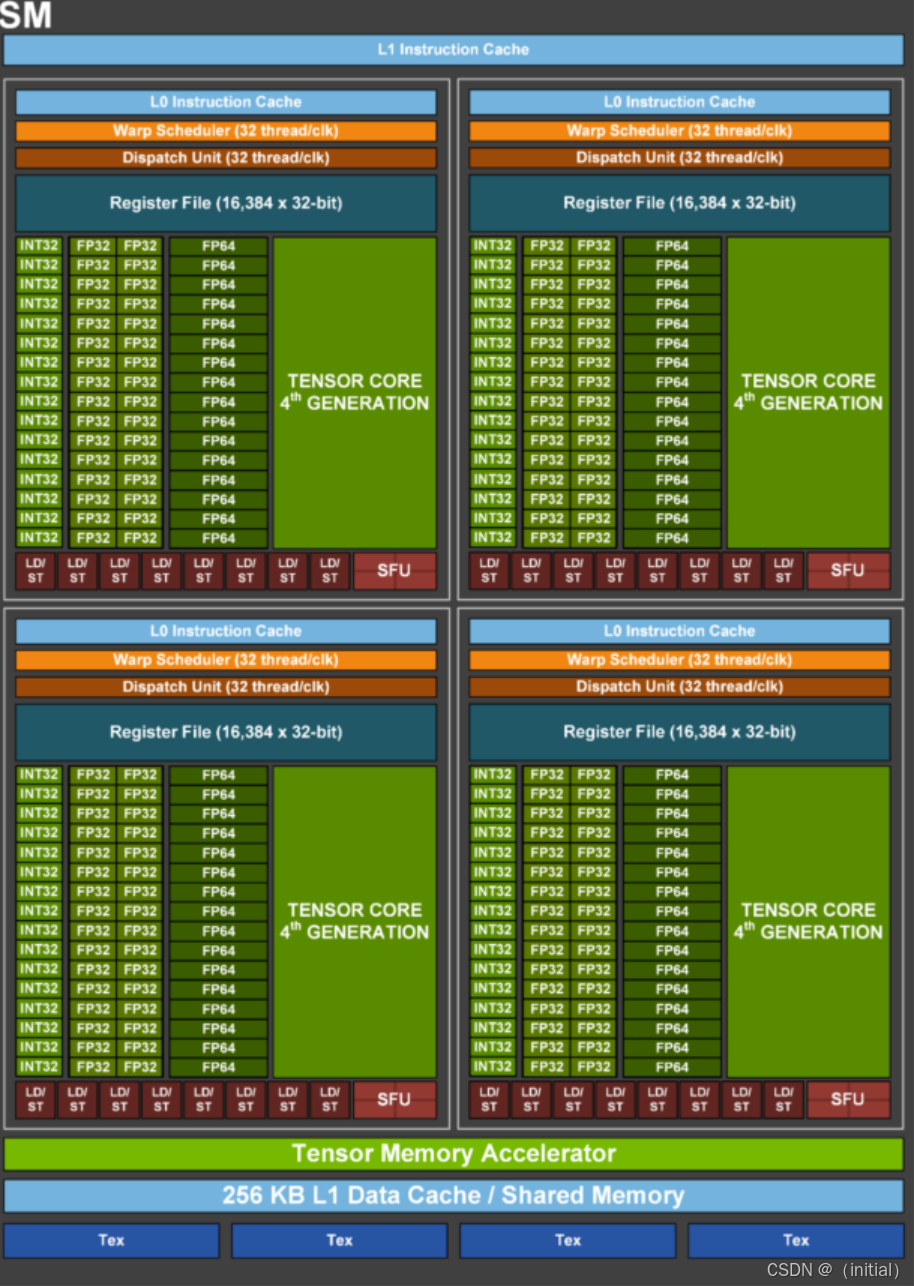 - Warp调度器:这些单元负责调度和管理张量核心上线程束(线程组)的执行。它们确保MMA单元保持繁忙状态,并优化数据流以实现高效计算。