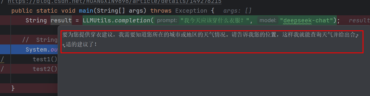 String result = LLMUtils.completion("我今天应该穿什么衣服?", "deepseek-chat");