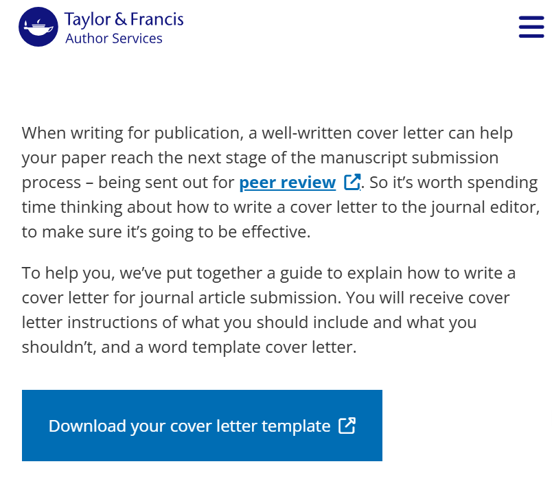 How to write a cover letter for journal submission | Author Services 注意:写完后检查一下,主编姓名写对着没,期刊名是否更新了(如换期刊投稿时,或者期刊更名的),通讯邮箱是否有效(建议用机构邮箱)。投稿信是论文的敲门砖,一定要重视~