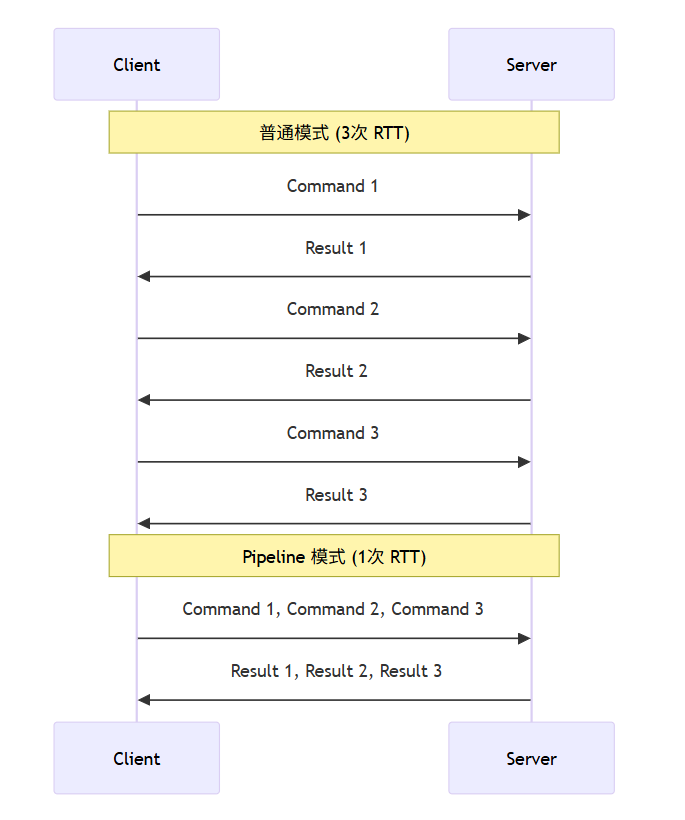Pipeline 允许客户端一次发送多个命令,服务端一次性处理并返回结果,大大减少了 RTT。