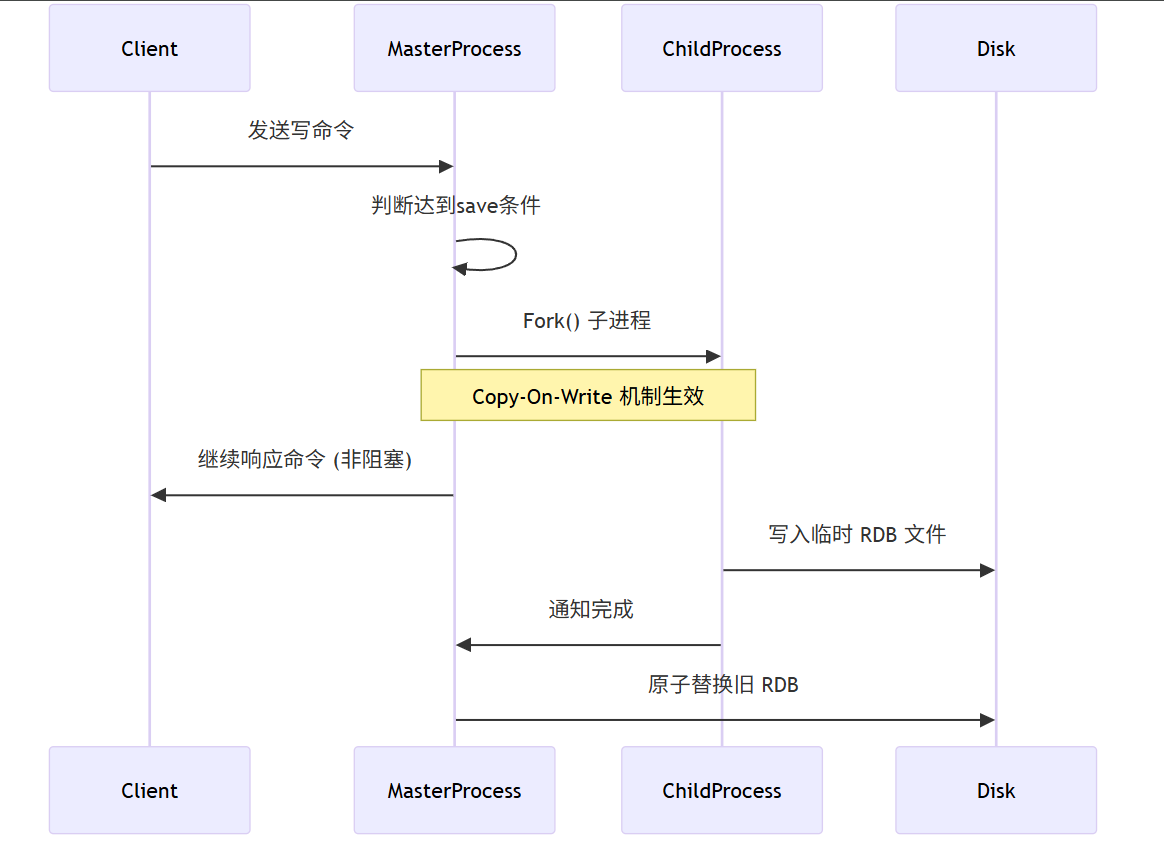 COW 机制:Linux 的写时复制机制保证了父子进程共享内存页,只有当父进程修改数据时,才会复制该页面的副本。这使得快照过程极快且节省内存。
