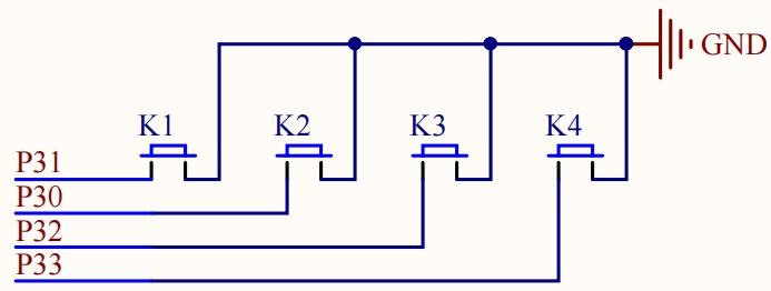 从上图中可以看出, 4 个独立按键的控制管脚连接到 51 单片机的 P3.0-P3.3脚上。 其中 K1 连接在 P3.1 上, K2 连接在 P3.0 上, K3 连接在 P3.2 上, K4 连接在 P3.3 上。 4 个按键另一端全部连接在 GND, 当按键按下后, 对应 IO 口即为低电平。