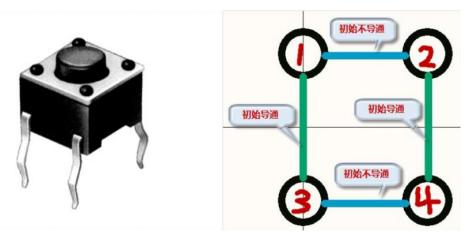 按键管脚两端距离长的表示默认是导通状态, 距离短的默认是断开状态, 如果按键按下, 初始导通状态变为断开, 初始断开状态变为导通。