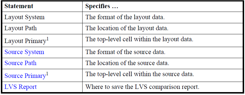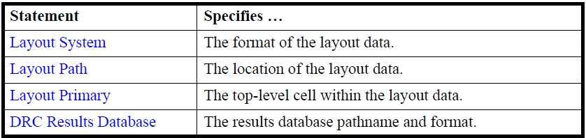 - 规格描述语句 ------ 除命令行的调用参数外,规则文件中的规格描述语句用于控制 Calibre 工具的功能运行环境,例如定义版图与源数据库、指定运行结果的存储路径。这类语句同时也会对工具的内部启发式算法进行引导。