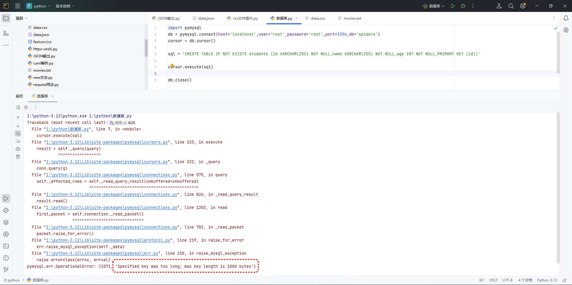 cursor.execute("CREATE DATABASE spiders DEFAULT CHARACTER SET utf8mb4")