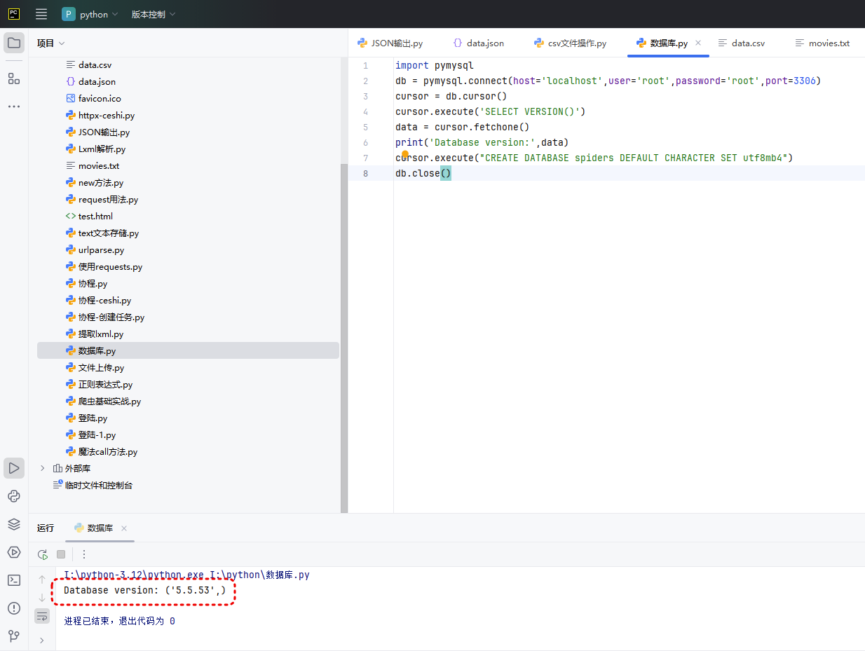cursor.execute("SELECT VERSION()") cursor.execute("CREATE DATABASE spiders DEFAULT CHARACTER SET utf8mb4") cursor.execute("INSERT INTO users (name) VALUES ('Alice')") -